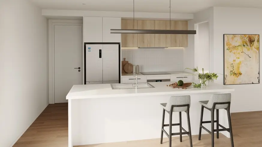 - Stone benchtop, Fisher & Paykel appliances with induction cooktop