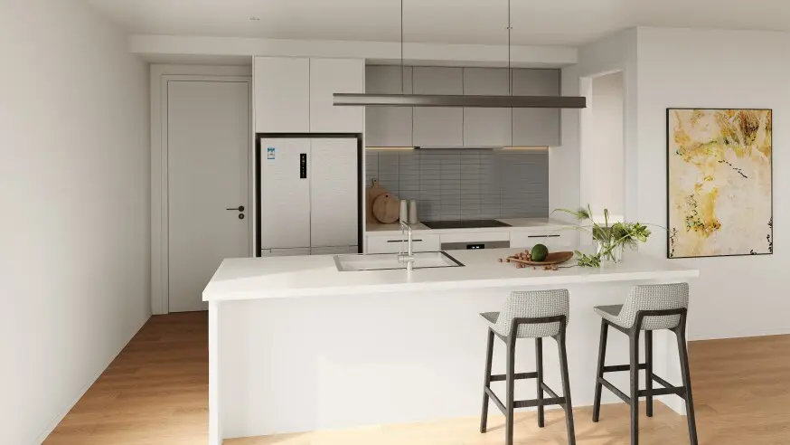 - Stone benchtop, Fisher & Paykel appliances with induction cooktop