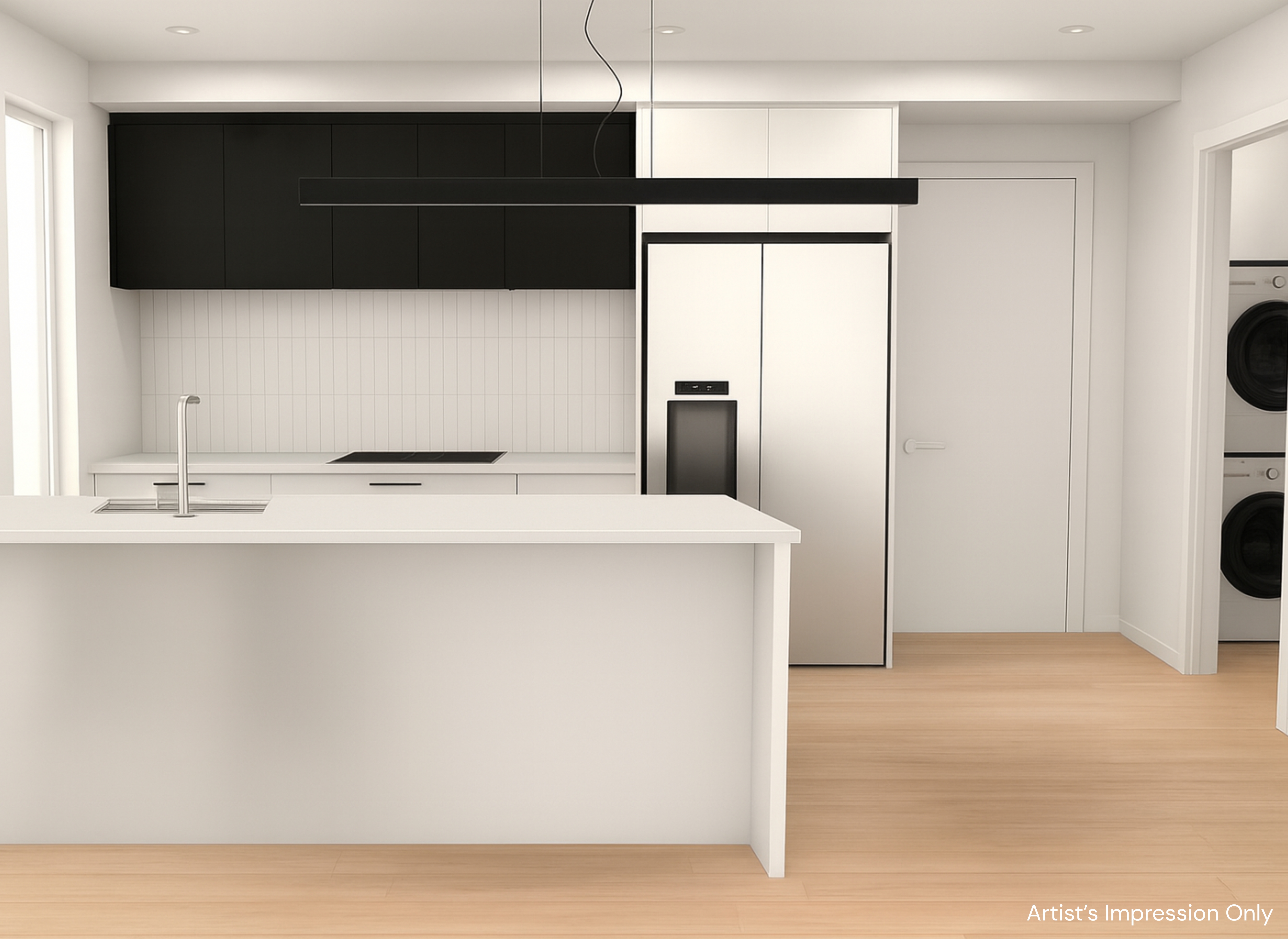 - Stone benchtop, Fisher & Paykel appliances with induction cooktop
