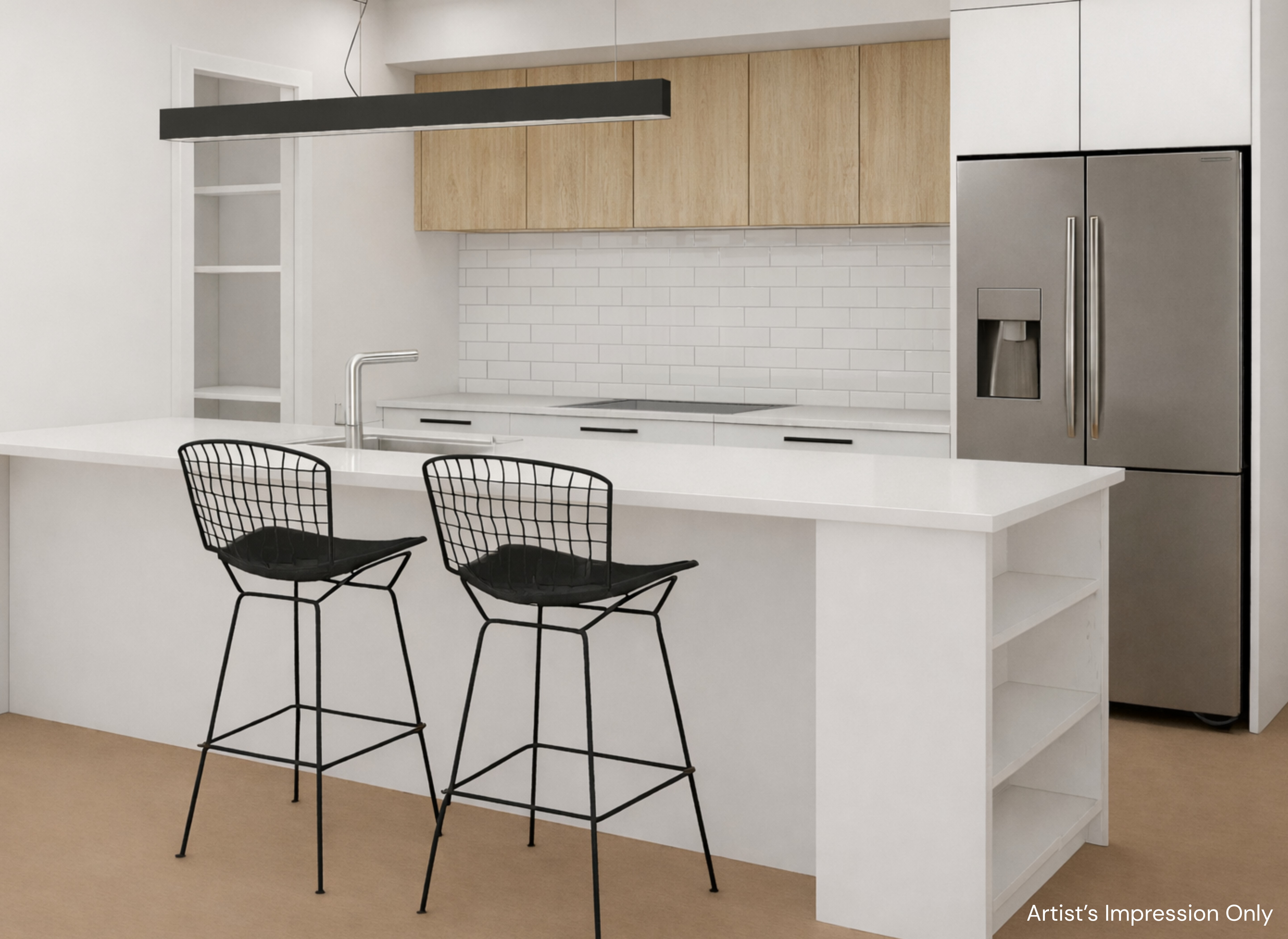 - Stone benchtop, Fisher & Paykel appliances with induction cooktop