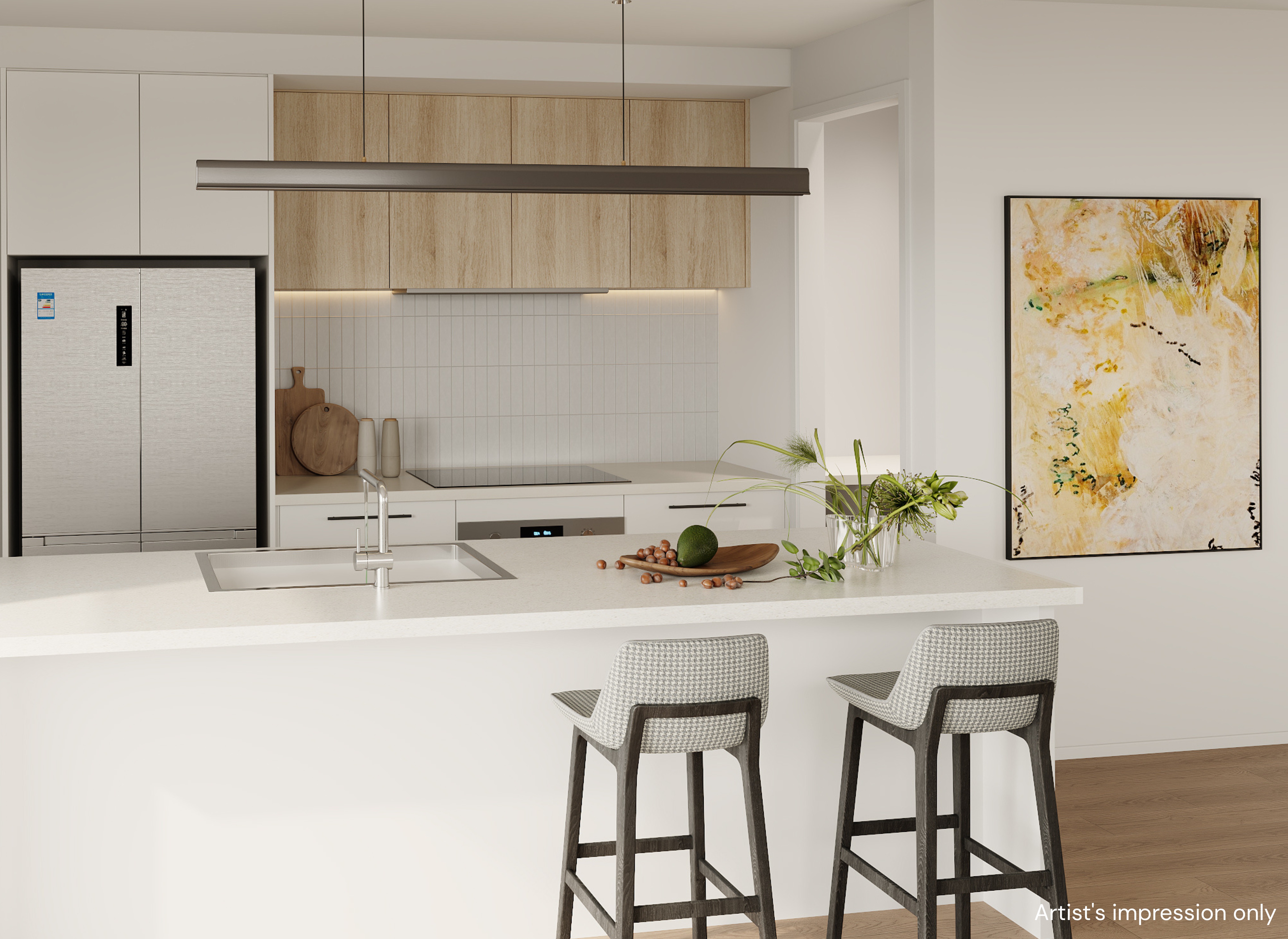 - Stone benchtop, Fisher & Paykel appliances with induction cooktop