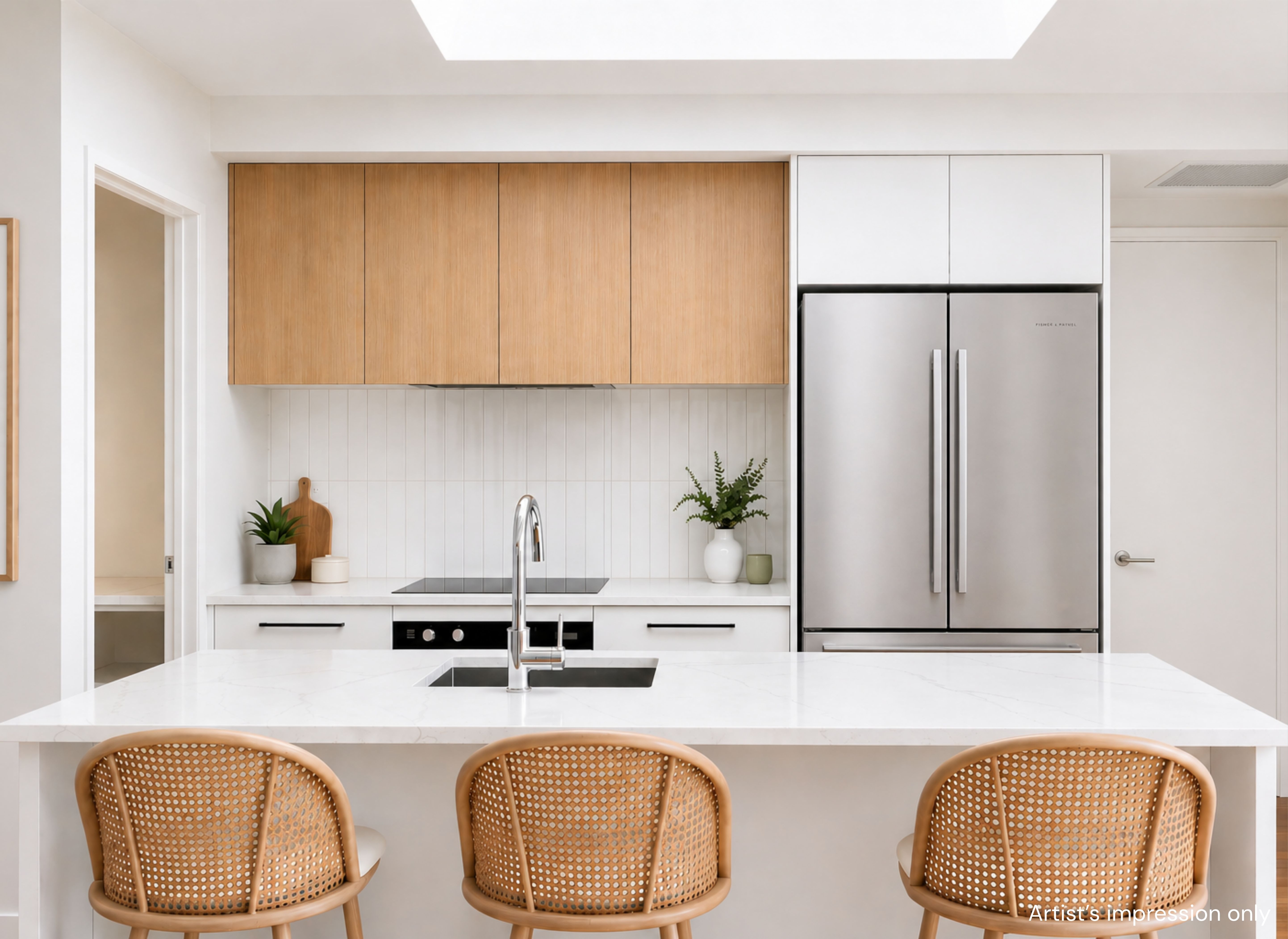 - Stone benchtop, Fisher & Paykel appliances with induction cooktop