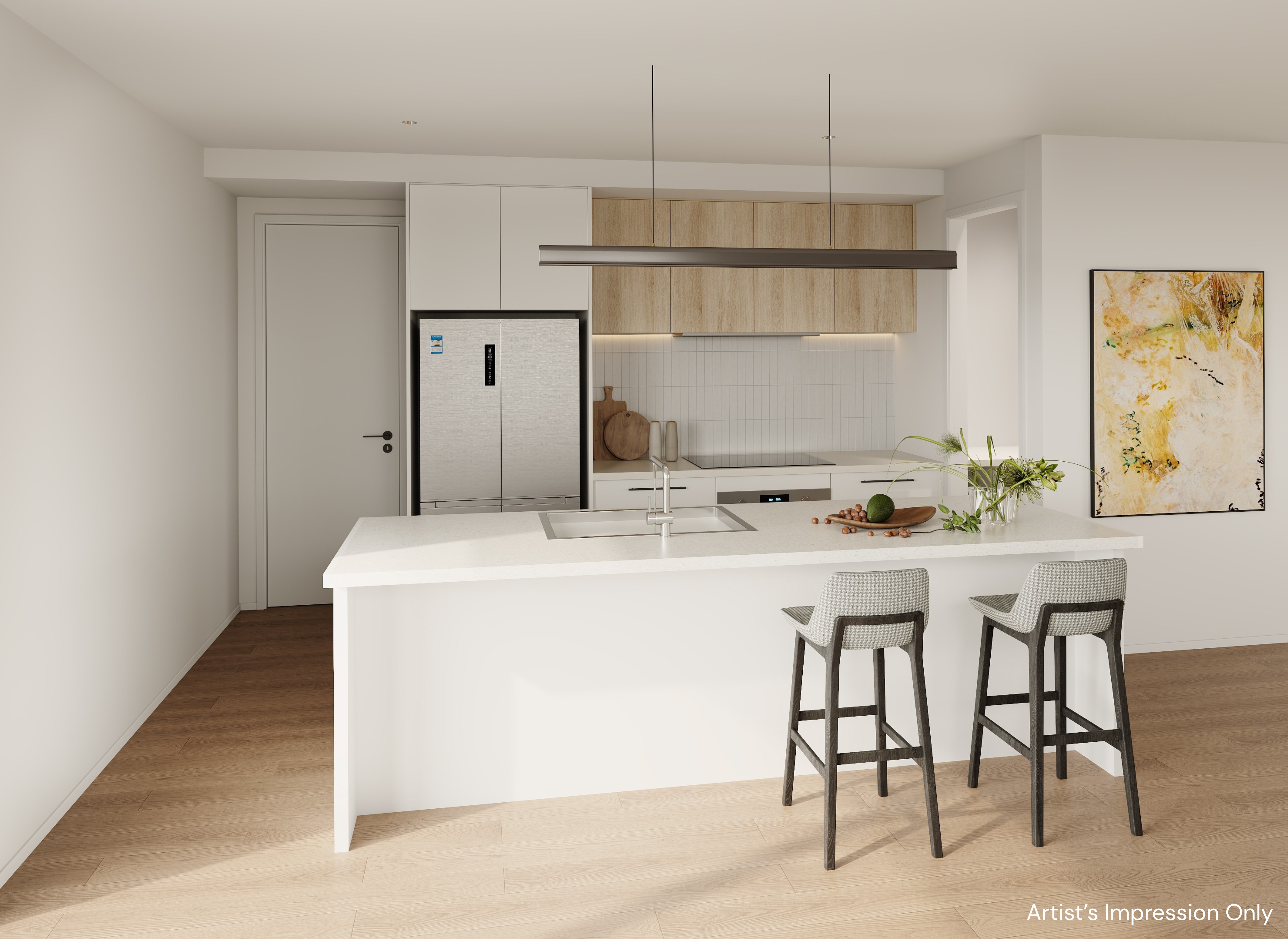 - Stone benchtop, Fisher & Paykel appliances with induction cooktop