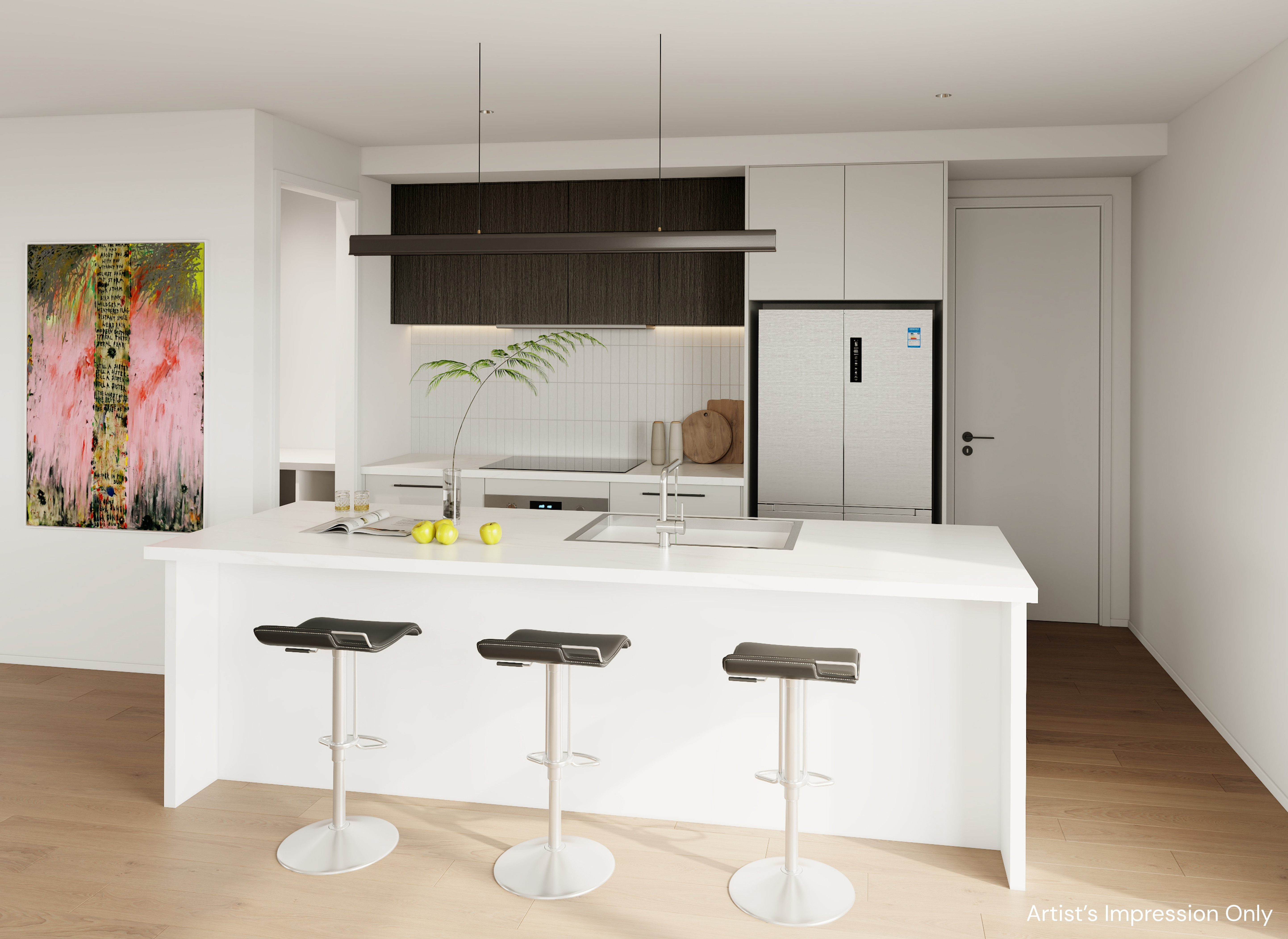 - Stone benchtop, Fisher & Paykel appliances with induction cooktop