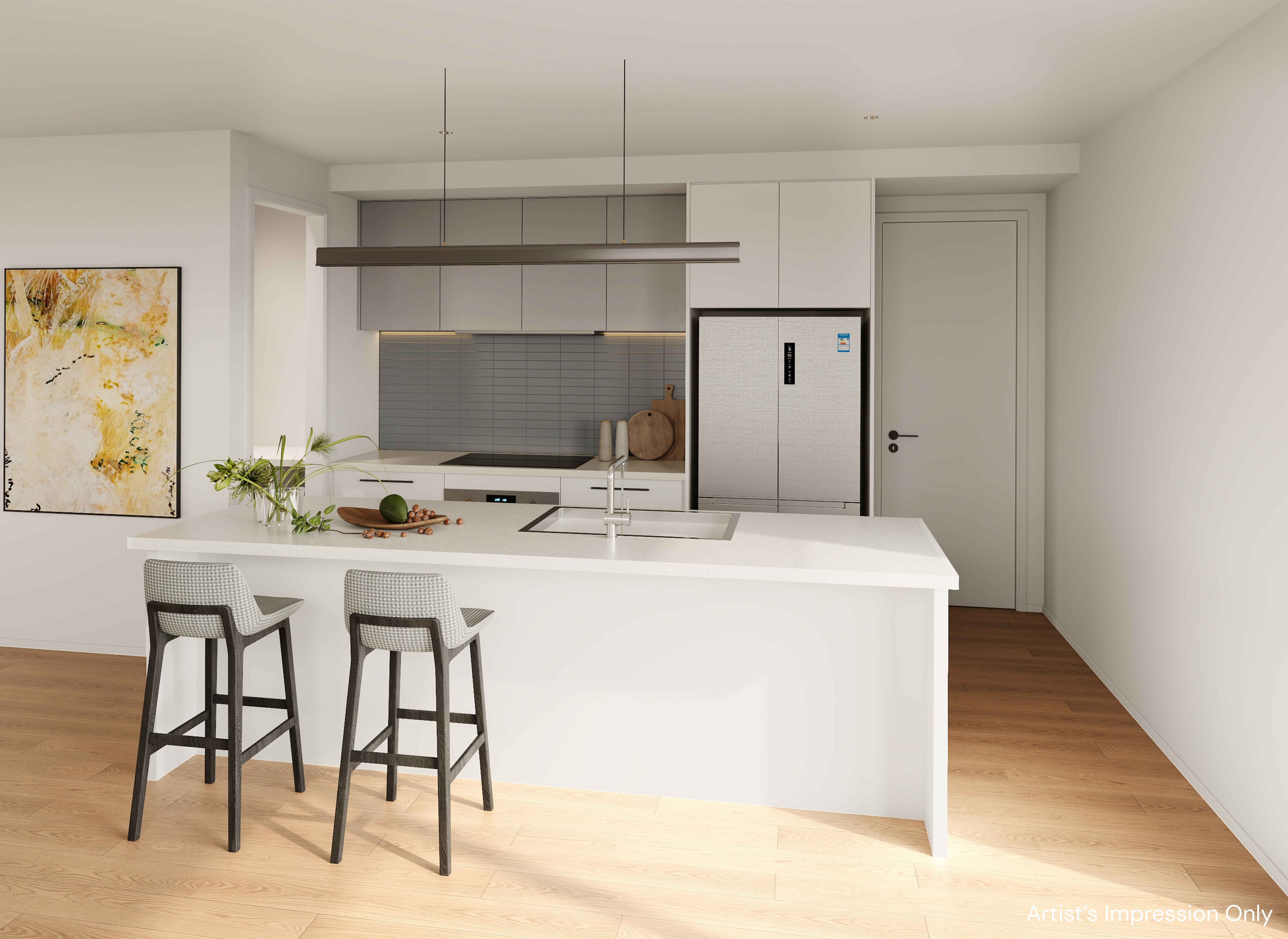 - Stone benchtop, Fisher & Paykel appliances with induction cooktop