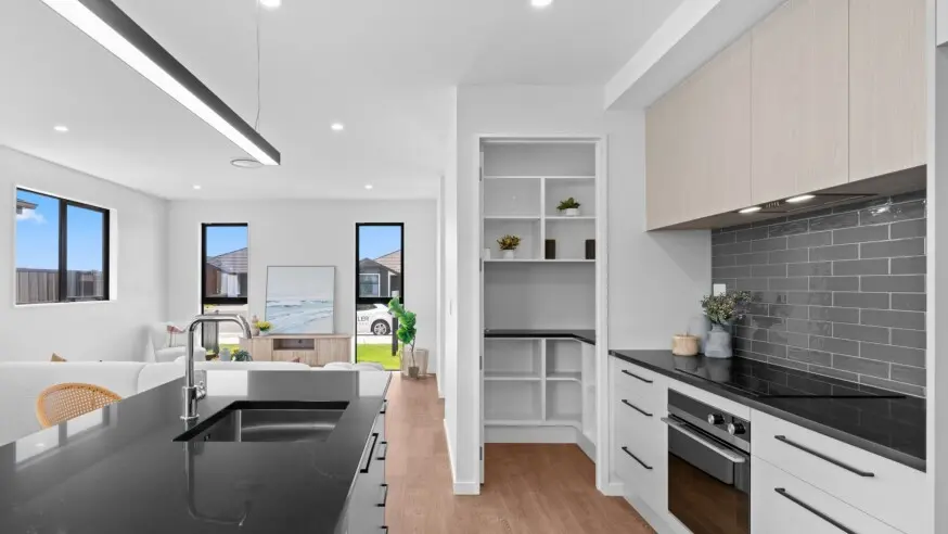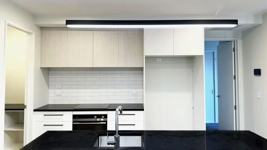 - Stone benchtop, Fisher & Paykel appliances with induction cooktop