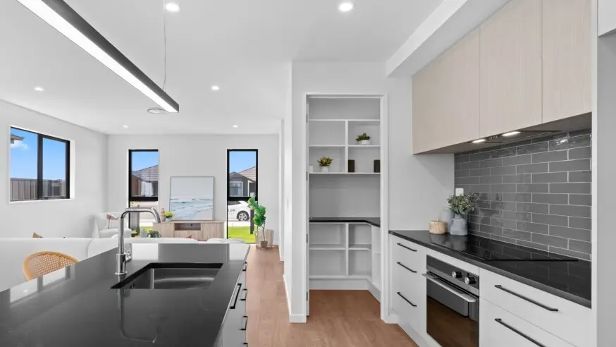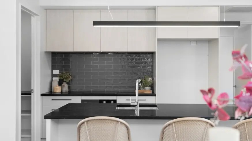 - Stone benchtop, Fisher & Paykel appliances with induction cooktop